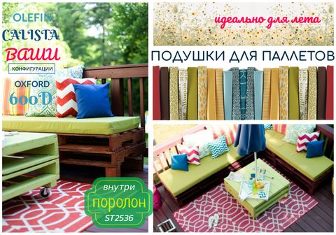 Описание Мы готовы в кратчайшие сроки изготовить готовые комплекты подушек под евро паллеты. Состав комплекта на одну секцию Сидушка сделана из поролона марки ST2536, с внутренним чехлом из синтепона и спанбонда, съемным чехлом на скрытой молнии. Крепеж подушки к паллете на липучках велькро 50 мм. Материал – уличная ткань OXFORD 600D. Цвет на выбор. Размер 800*1200*80. Спинки – это две комфортные подушки 600*600, одна подушка 350*350, набивка синтешар. Внутренний чехол из спанбонда. Съемный чехол из уличной ткани OXFORD 600D. Данный набор устойчив к любым погодным условиям, легко чистить и стирать. Срок производства от 5 рабочих дней. Отправка по всей России. Свое производство. Свой склад тканей и комплектующих.
