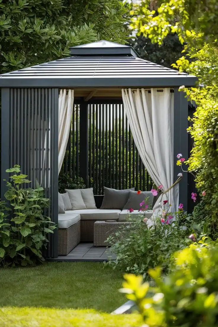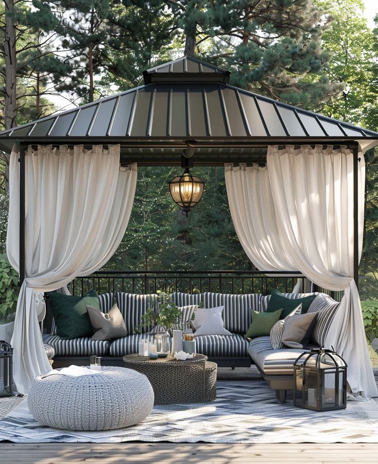 Плотные шторы из уличных или универсальных тканей укроют от ветра и дождя, а сетка или вуаль помогут скрыться от насекомых и пыли.