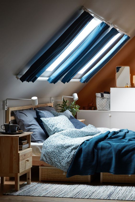 Дано: перед нами мансарда – помещение с ломанным потолком, небольшими окнами в торце или крыше. Это помещение может быть слишком жарким из-за того, что напрямую граничит с крышей, а также и потому, что нет возможности грамотной драпировки окон. Нам как специалистам по текстилю особенно интересно разобраться именно с декорированием оконных проемов.